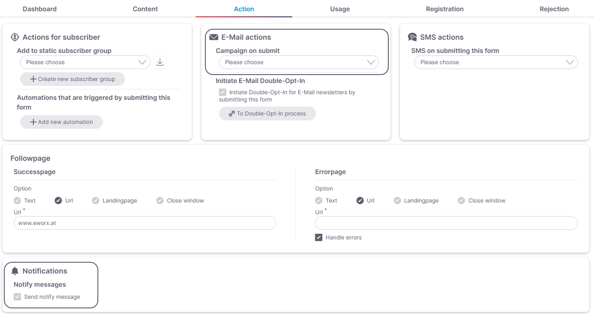 You can also see at a glance on the dashboard which actions have been defined for the form. You can choose between actions for recipients and actions for users. You can also see whether a success and error page has been configured.