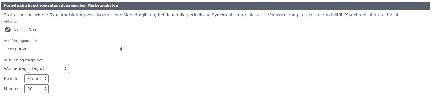 Anschließend kann die periodische Synchronisierung von dynamischen Marketinglisten in den „CRM Online Konfigurationen“ (am Ende der Seite) aktiviert werden. Dabei kann ausgewählt werden, ob die Ausführung stündlich, täglich oder wöchentlich stattfinden soll.