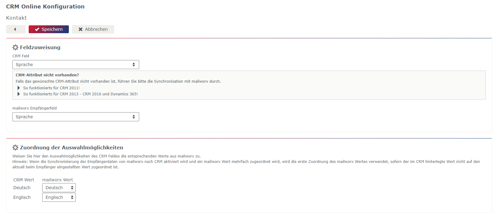 Die Sprache kann in den Feldzuweisungen in der eworx Marketing Suite konfiguriert werden, sofern im CRM ein entsprechendes Feld dafür existiert. Diese finden Sie unter „Administration“ (rechts oben im Userbereich) > „Integrationen“ (in der Seitennavigation) > „CRM Online konfigurieren“ wenn Sie in den Reiter „Unternehmenseinheiten“ wechseln. Erstellen oder bearbeiten Sie anschließend eine bestehende Unternehmenseinheit. Anschließend können Sie eine neue „Feldzuordnung“ hinzufügen. Dadurch wird das Standardfeld für die Sprache des Empfängers befüllt (in beide Richtungen).