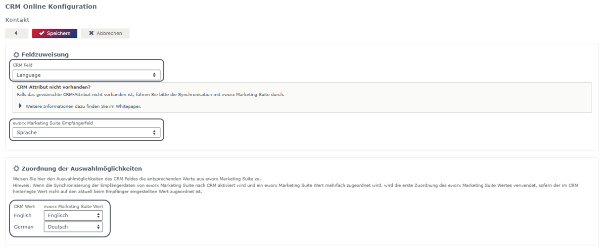 Führen Sie unbedingt ein Sprach-Mapping durch! Sonst werden alle Kontakte/Firmen/Leads mit der Standardsprache des eworx Marketing Suite Mandanten (meistens Deutsch) in die eworx Marketing Suite übertragen.
