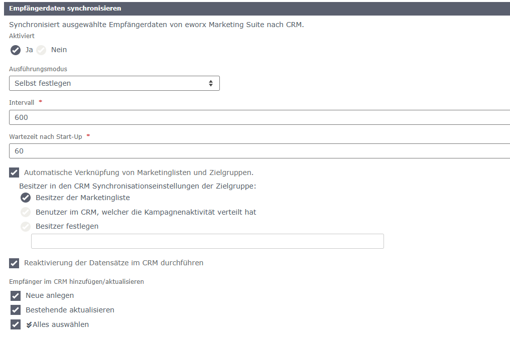 Das Übertragen der Daten für verknüpfte Entitäten funktioniert nur von Ihrem CRM System in die eworx Marketing Suite, nicht jedoch umgekehrt.