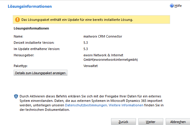 Integrieren Sie im CRM System in den erweiterten Einstellungen unter „Einstellungen„ > „Lösungen„ > „Importieren“ die verwaltete Lösung. Sollten Sie eine On-Premise Lösung aus dem Mailing heruntergeladen haben, dann verwenden Sie zum Import bitte einen Benutzer, der Bereitstellungsadministrator ist.