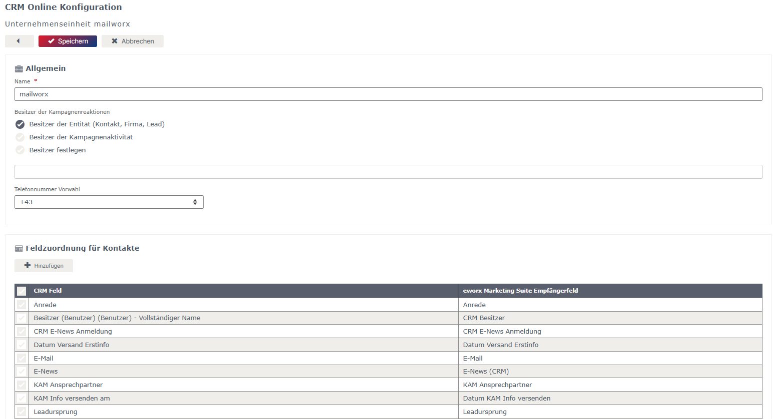 Legen Sie zuerst im Reiter „Unternehmenseinheiten“ eine Unternehmenseinheit an. Geben Sie den Namen der Unternehmenseinheit (Achtung: Groß- und Kleinschreibung beachten) aus Ihrem CRM System an und bestimmen Sie, wer als Besitzer der generierten Reaktionen (Klicks, Öffnungen) in Ihrem CRM System eingetragen wird. Klicken Sie anschließend auf „Speichern“ (erst dann werden auch die Feldzuordnungen aktiviert):