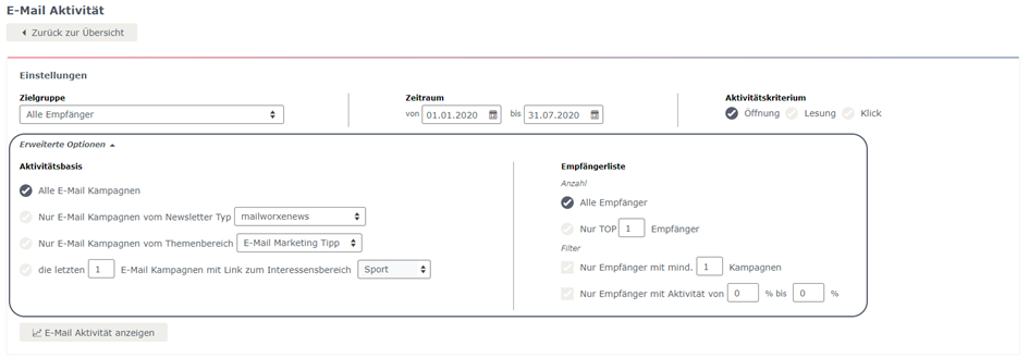 Zusätzlich haben Sie noch die Möglichkeit, durch erweiterte Optionen die Parameter Ihrer Auswertung zu verfeinern. Dabei unterscheidet die eworx Marketing Suite die Bereiche Aktivitätsbasis sowie Empfängerliste.