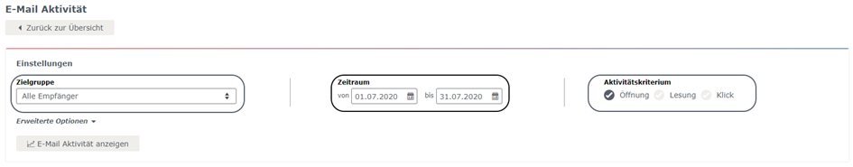 Im Reiter „E-Mail Aktivität“ in der Empfängerstatistik haben Sie mehrere Einstellungsmöglichkeiten. Zuerst wählen Sie die entsprechende Zielgruppe für Ihre Analyse und schränken den gewünschten Zeitraum ein. Im Bereich Aktivitätskriterium können Sie definieren, ob Sie die Aktivität Ihrer Empfänger anhand der Öffnungen, Lesungen oder Klicks analysieren möchten.