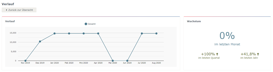Unter „Empfänger“ > „Empfängerstatistik“ finden Sie im Reiter „Übersicht“ einen Empfänger-Verlauf. In diesem Bereich bekommen Sie einen guten Überblick über Ihre aktuellen sowie vergangenen Empfängerzahlen. Neben der grafischen Darstellung des Verlaufs über die vergangenen Monate, sehen Sie auch das Wachstum Ihres Empfängerstammes in prozentuellen Werten.