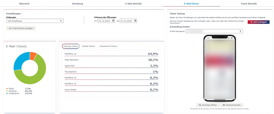 Damit Sie eine optimale Darstellung Ihrer Newsletter garantieren können, ist es hilfreich, diese im Vorfeld zu testen. Durch die TOP Clients beziehungsweise die detaillierte Client Liste bekommen Sie einen Überblick zu den verwendeten Clients Ihrer Empfänger. Anhand dieser Information können Sie Ihres Tests priorisieren und gezielt durchführen.