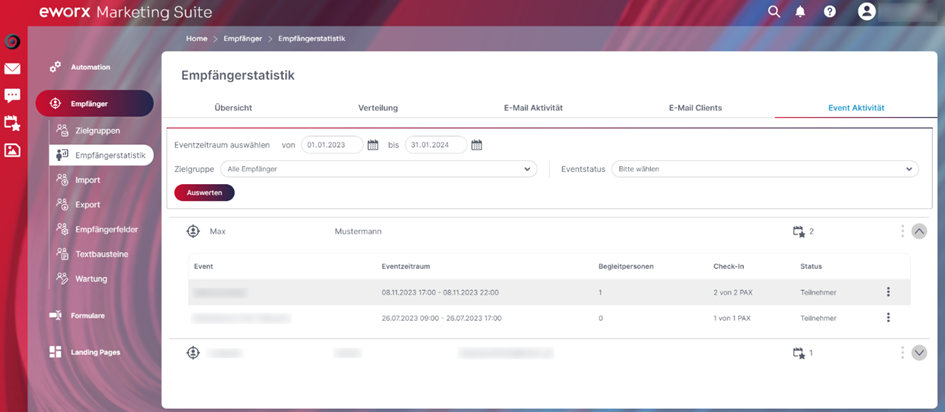 In der „Empfängerstatistik“ ist der Tab „Event Aktivität“ für jene Benutzer ersichtlich, welche die Berechtigung haben, events zu nutzen. Unter „Event Aktivität“ erhalten Sie eine Übersicht der Top Empfänger bezogen auf Interaktionen mit Events, sowie eine Übersicht über alle Eventinteraktionen pro Empfänger. Diese Funktion ist filterbar nach Zielgruppe, Eventzeitraum und Status des Gastes.