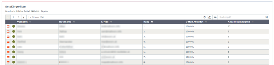 Durch einen Klick auf den Button „E-Mail Aktivität anzeigen“ bekommen Sie die aufschlussreichen Ergebnisse Ihrer Analyse in Form einer Empfängerliste.