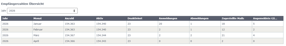 Was die grafische Darstellung in konkreten Zahlen bedeutet, sehen Sie direkt darunter. Über das Drop-Down können Sie zum gewünschten Jahr wechseln und sehen in einer detaillierten Liste, wie viele Empfänger im entsprechenden Jahr beziehungsweise Monat in Ihrem System waren – inklusive hilfreicher Informationen zu entsprechenden Metadaten.