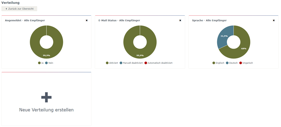 Die eworx Marketing Suite liefert Ihnen neben den bereits beschriebenen Standard-Auswertungen auch noch eine übersichtliche Information zu diversen Verteilungen Ihrer Empfänger. Unter anderem haben Sie direkt einen hilfreichen Einblick zu Ihren an- beziehungsweise abgemeldeten Empfängern, deren E-Mail Status sowie entsprechende Sprache Ihres Empfängerstammes.