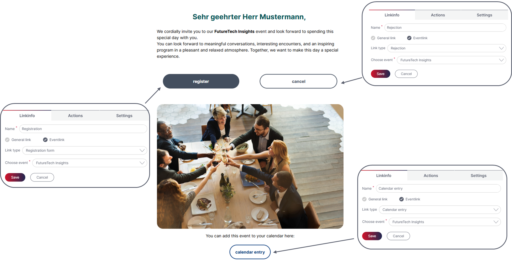 When creating an email campaign for your event (e.g. invitation or reminder) you can choose from different event links and link functions: