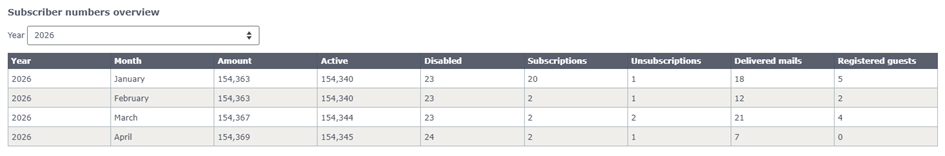 You can see what the graphical representation means in specific figures directly below. Using the drop-down menu, you can select the year you want and view a detailed list showing how many subscribers were in your system in the relevant year or month – including helpful information on the corresponding metadata.