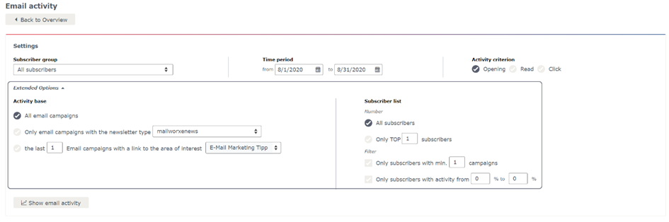 You also have the option of refining the parameters of your analysis using advanced options. The eworx Marketing Suite distinguishes between the activity basis and the subscriber list.