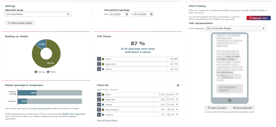 To ensure optimal display of your newsletters, it is helpful to test them in advance. The TOP Clients or the detailed client list provide an overview of the clients used by your subscribers. Using this information, you can prioritise your tests and carry them out in a targeted manner.