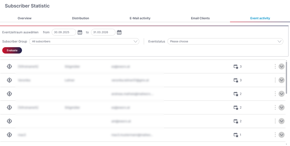 In the “Subscriber Statistics” section, the “Event Activity” tab is visible to users who have permission to use events. Under “Event Activity”, you will find an overview of the top subscribers based on interactions with events, as well as an overview of all event interactions per subscriber. This function can be filtered by subscriber group, event period and guest status.