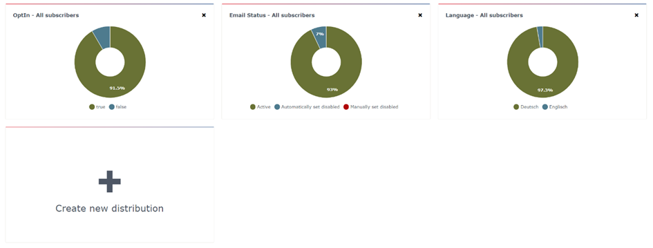 In addition to the standard reports described above, the eworx Marketing Suite also provides you with clear information on various distributions of your subscribers. Among other things, you have direct access to useful insights into your subscribed and unsubscribed subscribers, their email status and the language of your subscriber database.