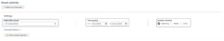 In the ‘Email Activity’ tab within the subscriber statistics, you have several configuration options. First, select the relevant subscriber group for your analysis and narrow down the desired time period. In the Activity Criteria section, you can define whether you wish to analyse your subscribers’ activity based on opens, reads or clicks.
