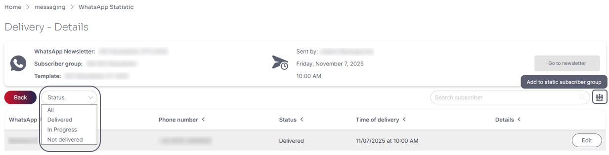 By clicking on the “detail view” button, you will receive a list of the respective subscribers. You can also add the subscribers to a static subscriber group. It is also possible to filter by status (Delivered, In Progress and Not delivered).