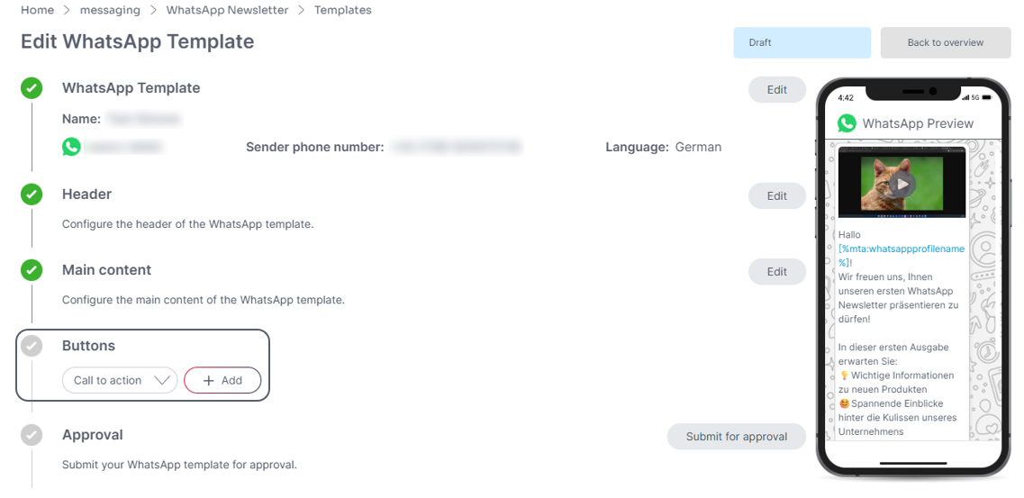 In order to use your template for the WhatsApp newsletter mailing, you must submit it for approval in advance.#