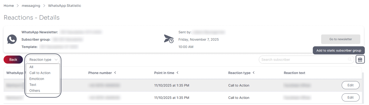 Here you can see which subscribers have reacted to the newsletter. Reactions are either a click on a link or button, or a reply to the newsletter message. Responses can be received as text messages (free text), emoticons or via other WhatsApp response options such as media, location or contact.