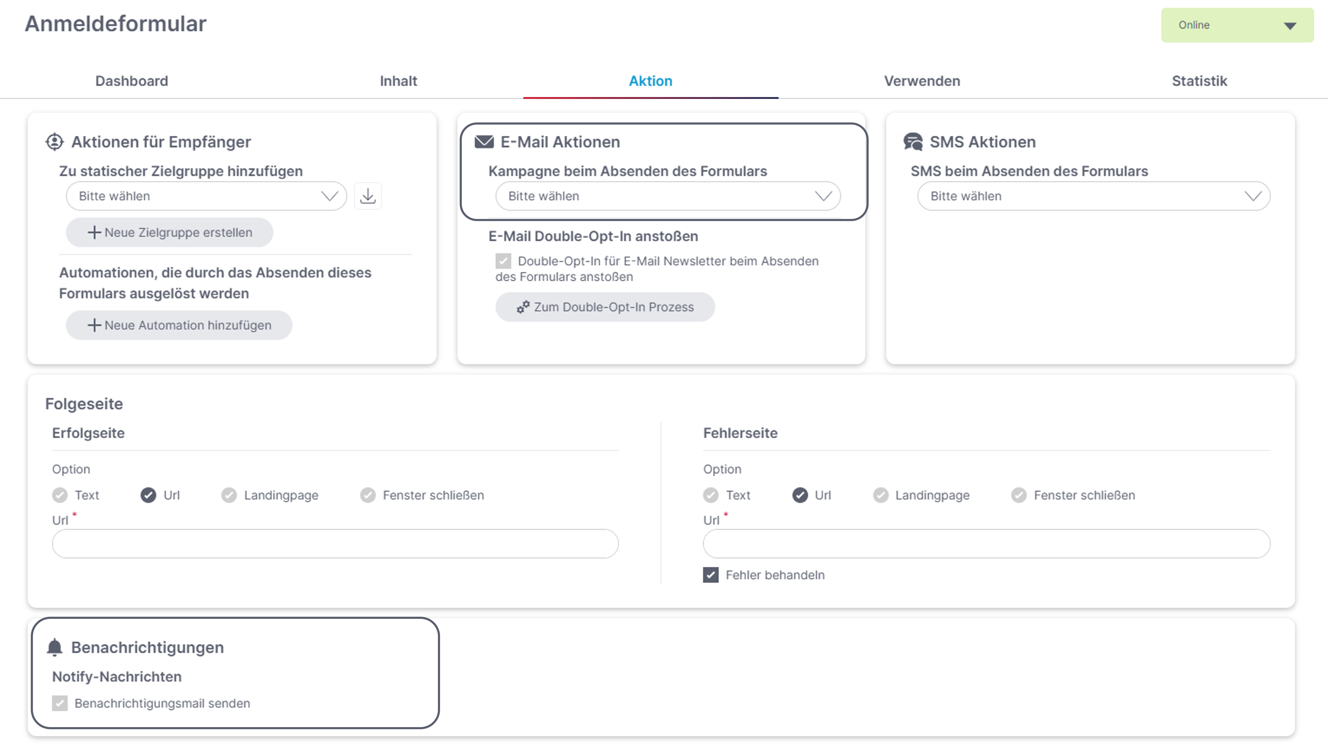 In der Registerkarte „Aktion“ können Sie bei „Kampagne beim Absenden des Formulars“ jene ereignisabhängige E-Mail oder SMS Kampagne auswählen, die Sie als Bestätigung für die Anmeldung versenden möchten. Hier ist es auch möglich, eine Kampagne aus dem „Newsletterarchiv“ auszuwählen. Bei Eventformularen ist es ebenfalls möglich, dass Eventformular zu einem gewünschten Event hinzuzufügen.