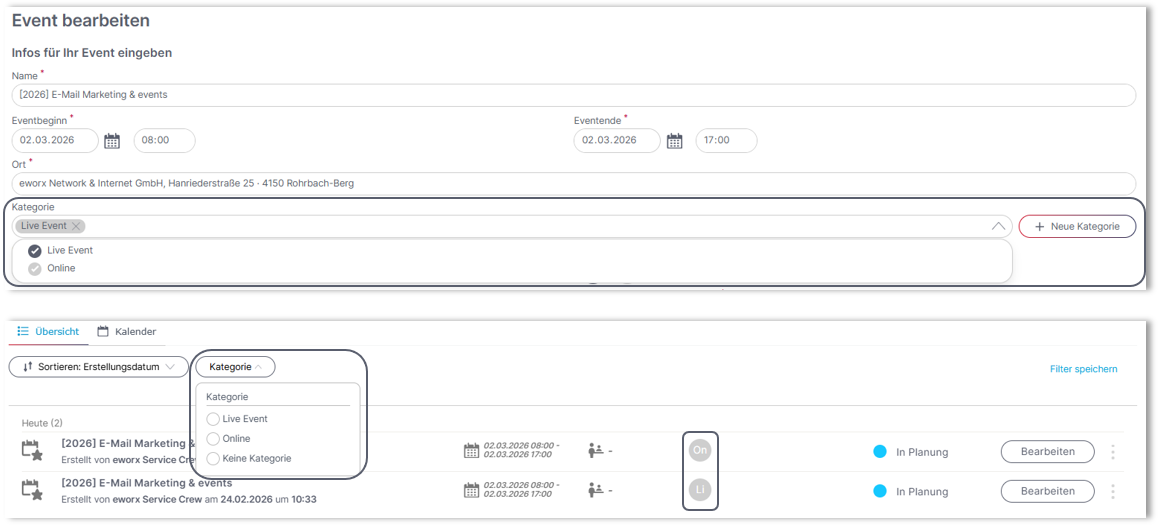 Die vergebenen Kategorien sind sowohl im Dashboard als auch in der Event-Übersichtsseite sichtbar. Zusätzlich besteht nun die Möglichkeit, die Übersichtsseite gezielt nach Kategorien zu filtern. So finden Sie relevante Events noch schneller und behalten auch bei einer großen Anzahl an Veranstaltungen den Überblick.