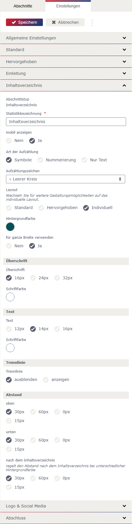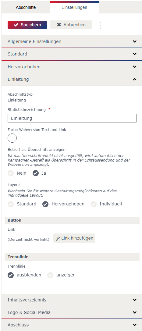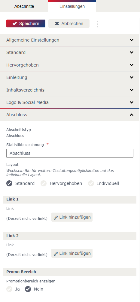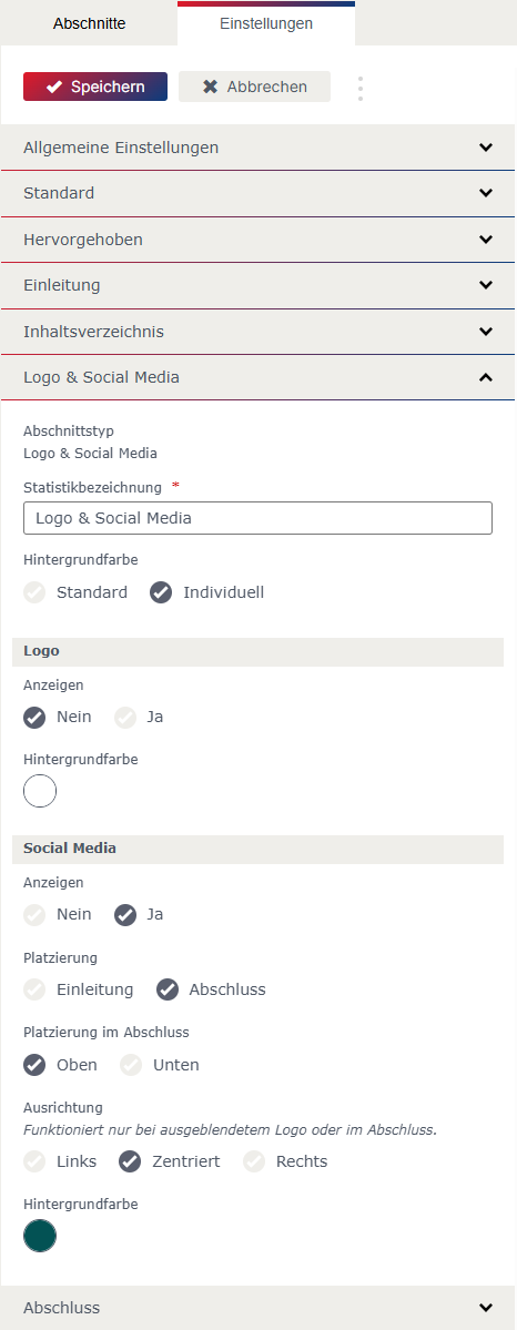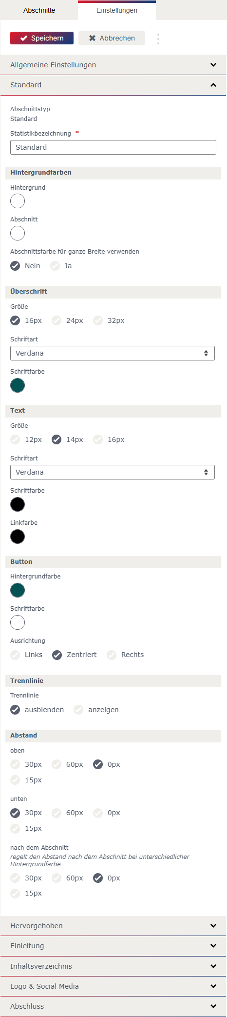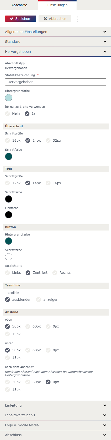 Bei einzelnen Abschnitten kann beim „Layout“ zwischen Standard, Hervorgehoben und Individuell gewählt werden. Die Einstellung für das „Layout“ Standard und Hervorgehoben können in den allgemeinen Einstellungen festgelegt werden.