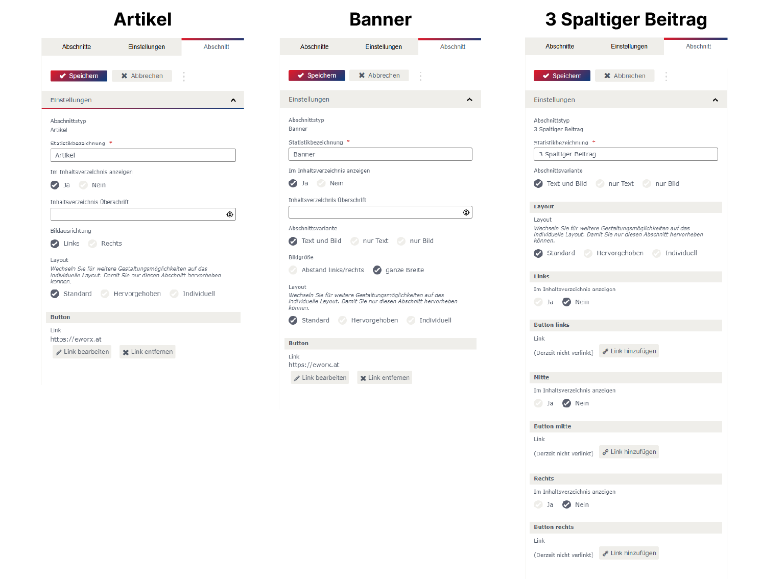 Auch beim 2– und 3 Spaltigen Beitrag kann zwischen verschiedenen Abschnittsvarianten (Text und Bild, nur Text, nur Bild) gewählt werden.