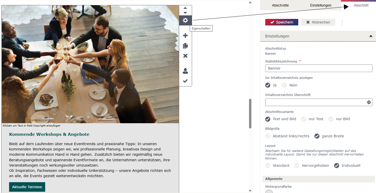 Bei allen Abschnittstypen kann in den Abschnitts-Eigenschaften das „Layout“ gewählt werden. Dabei kann zwischen Standard, Hervorgehoben und Individuell gewählt werden. Die Einstellung für das „Layout“ Standard und Hervorgehoben können in den allgemeinen Einstellungen festgelegt werden.