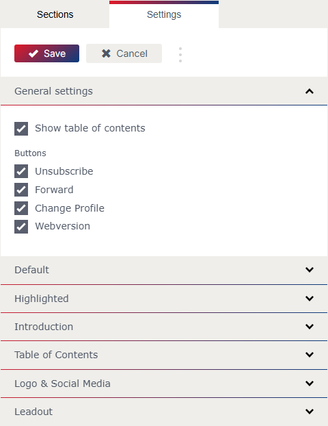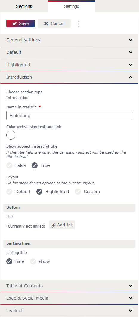 To the right of the editing area, there is the Settings tab. Here, you can configure “fixed” sections of the email campaign (e.g., buttons, introduction, conclusion).