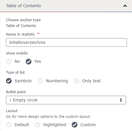 In the Table of Contents section, you can specify whether the table of contents should also be displayed in mobile view. You can also select the type of list: symbols, numbering, or only text.