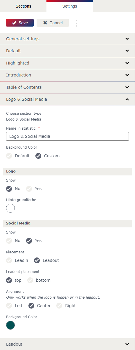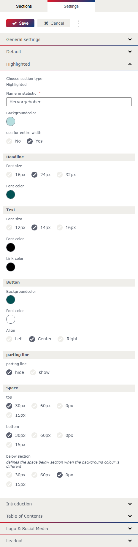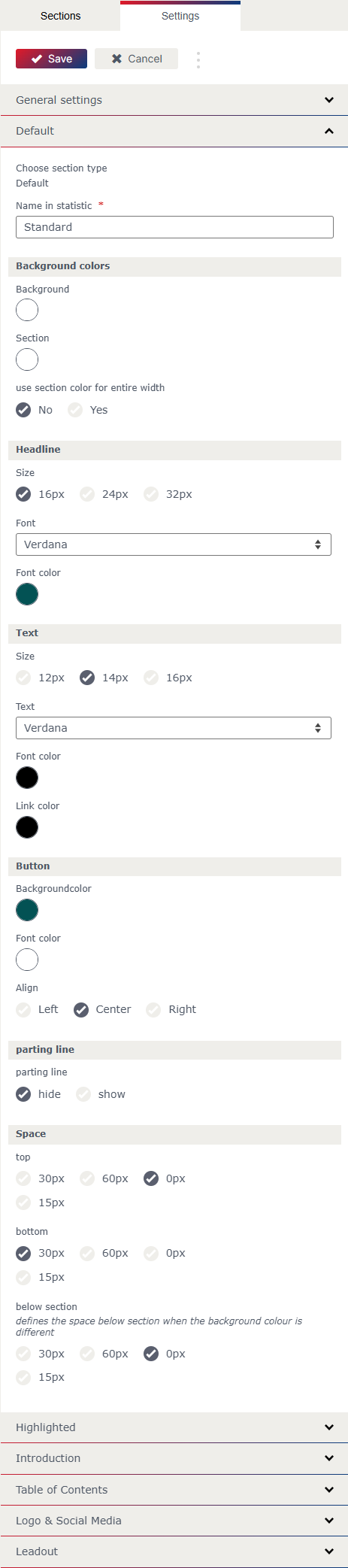For all section types, the “Layout” can be selected in the section properties. You can choose between Default, Highlighted, and Custom. The settings for the “Layout” Default and Highlighted can be defined in the general settings.