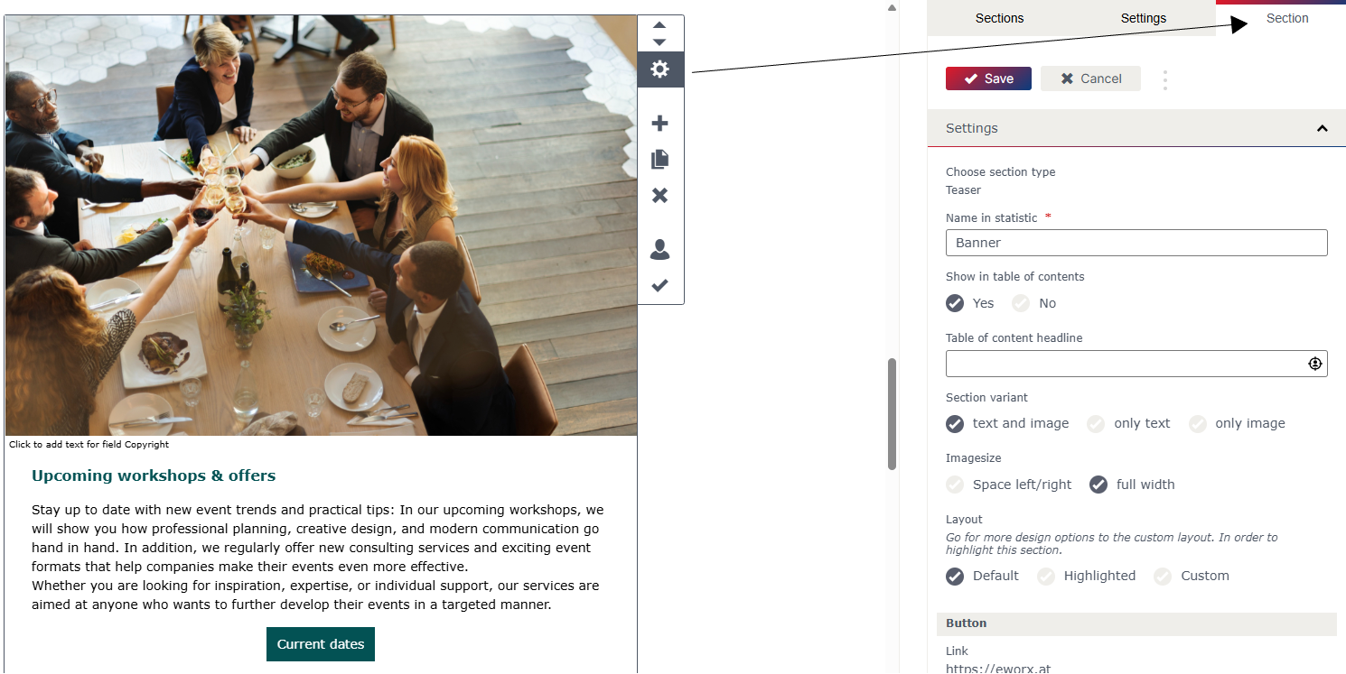 The menu bar to the right of the section contains important commands such as “Add,” “Move,” “Copy,” and “Delete.” It is also possible to restrict the visibility of the section for a specific target group (dynamic content). The gear icon takes you to the section settings, which may vary depending on the section type. In addition to the input field for the section's statistics name, you will find various setting options there.