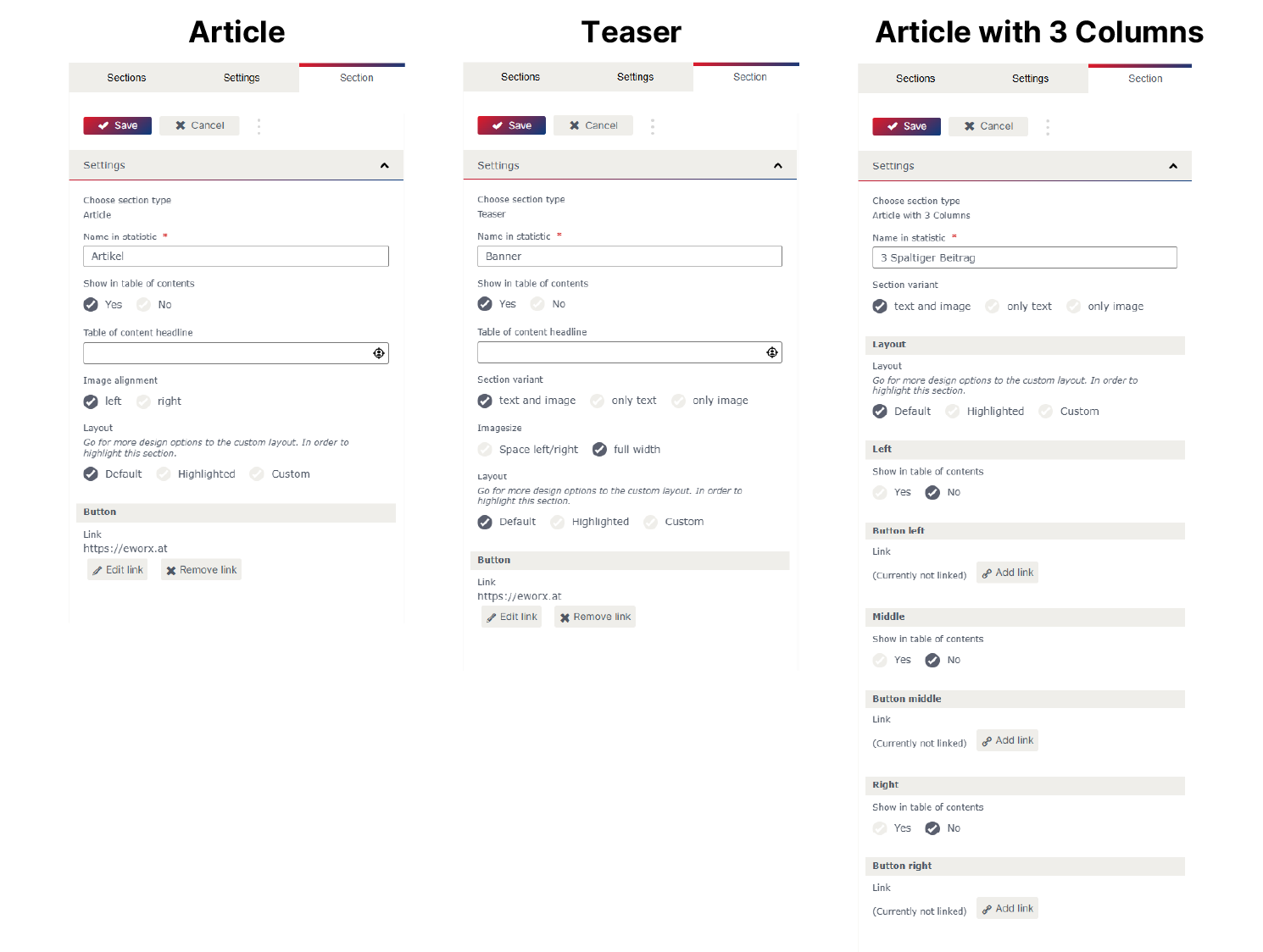 It is also possible to define the links for the buttons in the section properties for all sections. For multi-column sections (Article with 2/3 Columns), a button can be defined for each column.