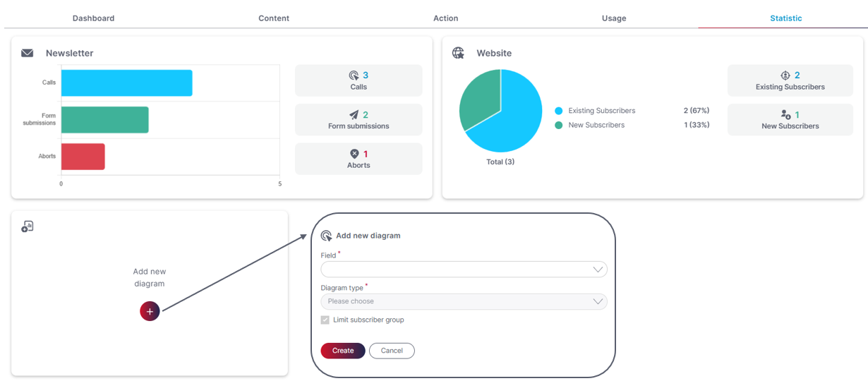 The form statistics also allow you to create custom charts. When creating a new chart, simply select the desired field and chart type (bar, column, pie, or doughnut chart). The chart can also be restricted to a specific subscriber group.