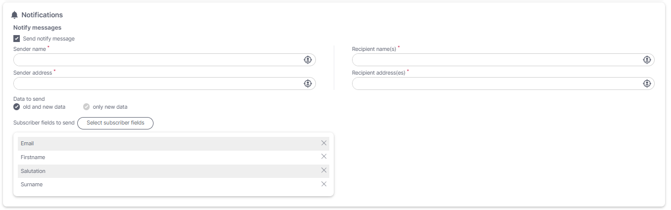 Values from subscriber fields are saved in the subscriber database. The standard form contains salutation, first name, surname and the email address.