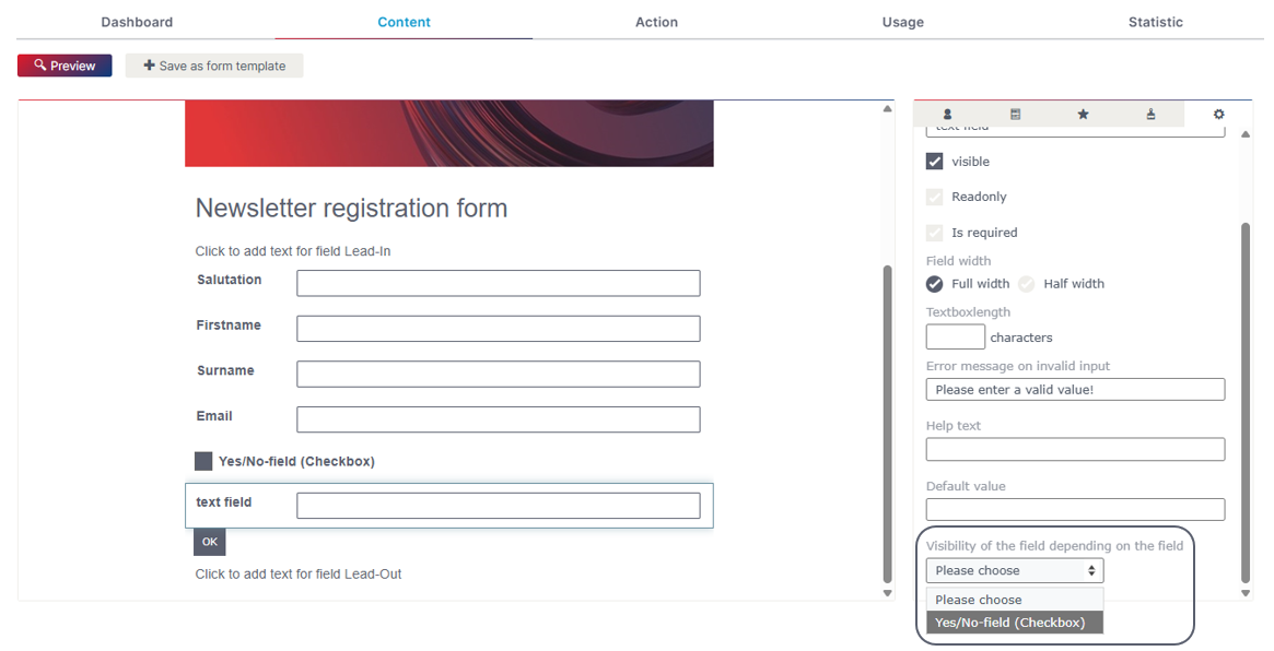 To do this, edit the desired field. This opens another tab on the right-hand side, where you will see the option “Visibility of the field depending on the field” at the bottom. If your form contains a “Yes/No” field, this field will be available for selection.