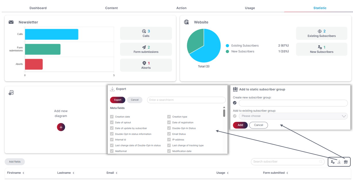 With the help of the form statistics, you can see at a glance which subscribers have submitted the form. A subscriber list is also available, which you can use to **export **the subscriber or add them to a static subscriber group.