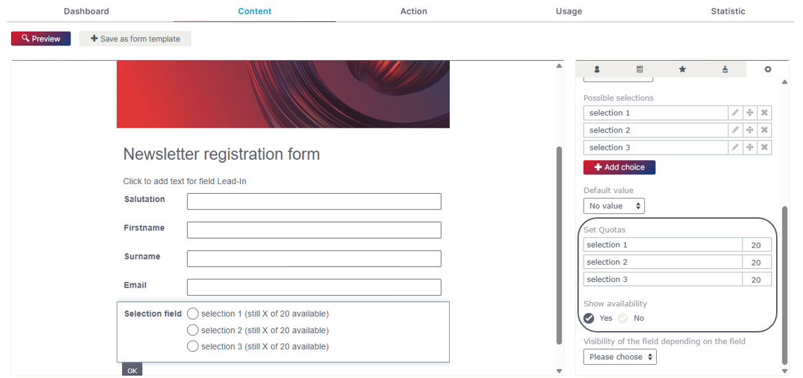 With “selection fields”, you have the option of displaying availability. There is a selection for this in the settings when the desired “selection field” is edited. You can specify the quotas for the respective selections in the field settings. With quotas, the subscriber is shown how many times the selection can still be made when filling out the form.