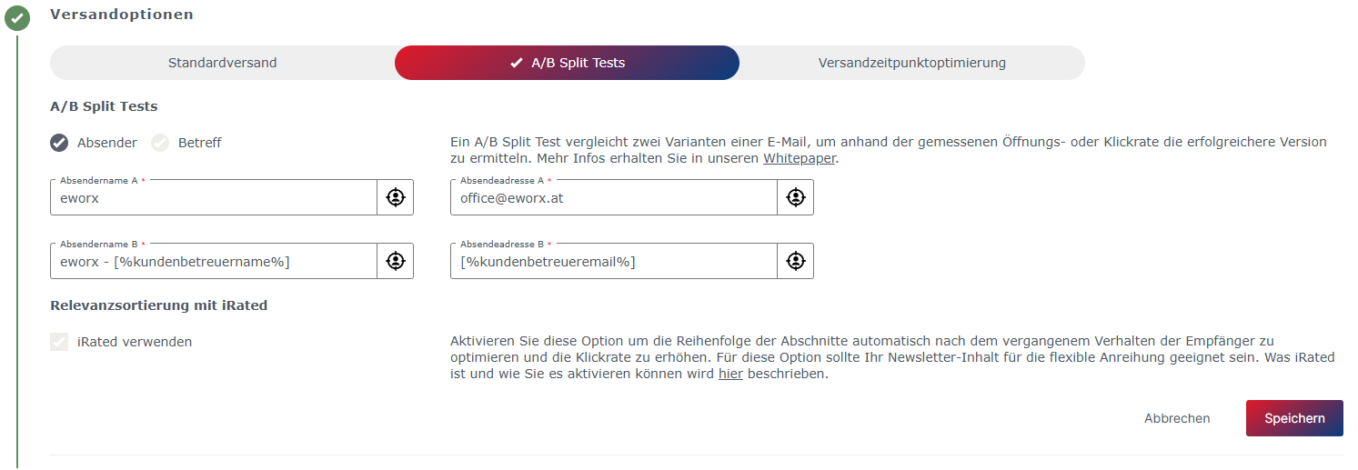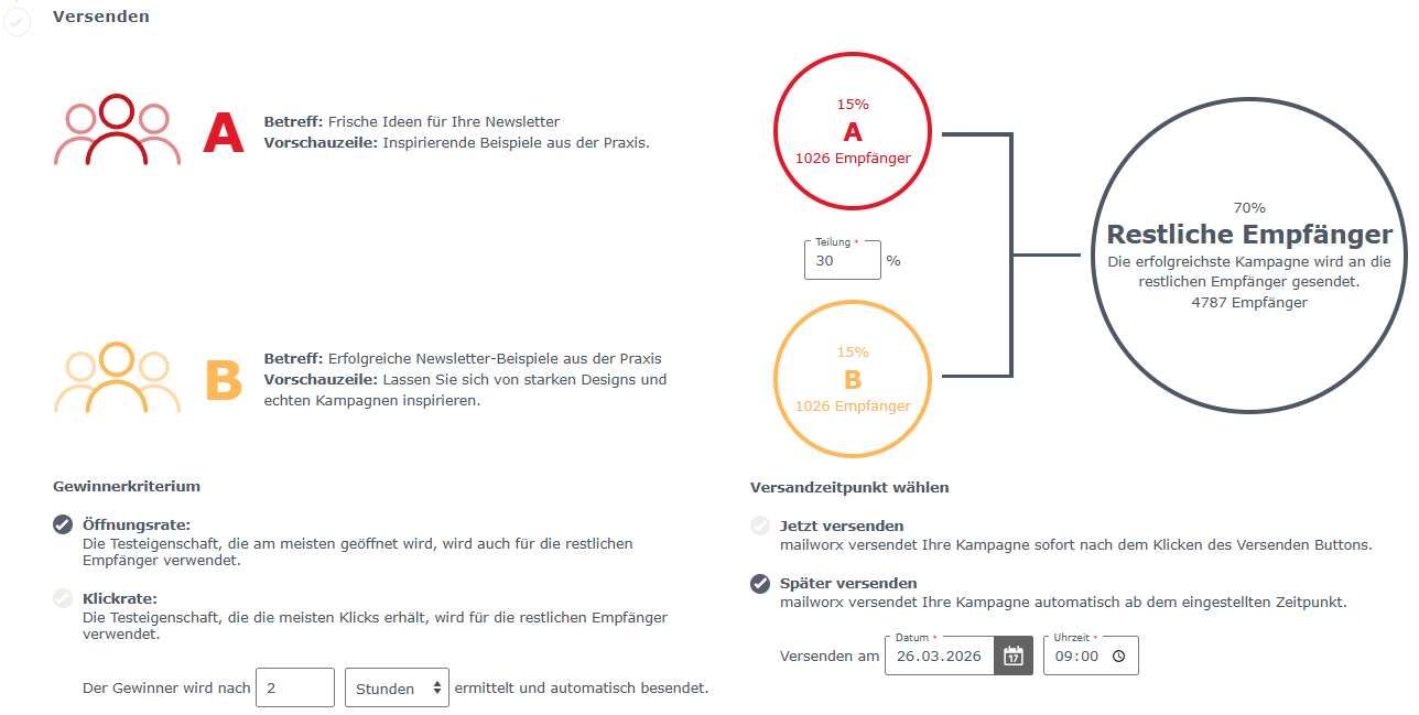 Dazu wird die Zielgruppe der Aussendung in drei Teile aufgeteilt: In zwei kleinere Testgruppen und eine Gruppe, welche die restlichen Empfänger enthält.