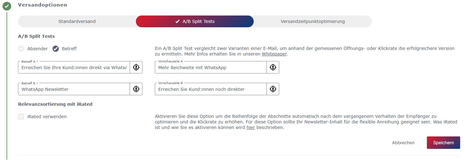Durch den A/B Split Test können Sie übrigens eine bis zu 2,5-mal höhere Klickrate und eine 50% höhere Öffnungsrate erreichen! Das haben Messungen über Millionen von E-Mails gezeigt!