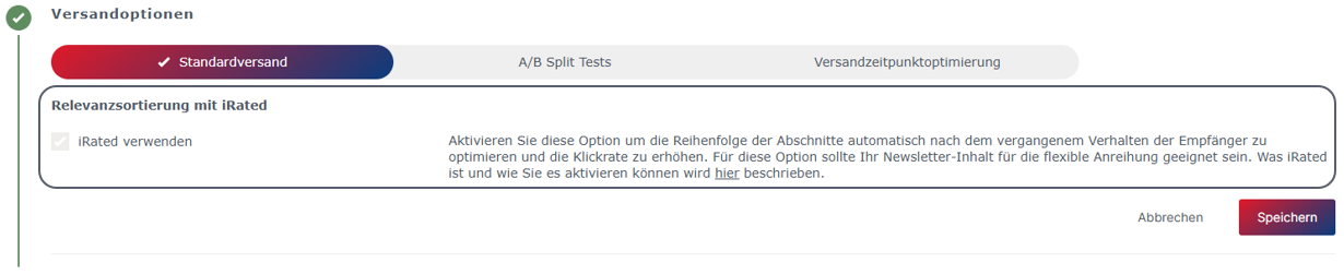 Um die iRated® Technologie für eine Kampagne zu verwenden, aktivieren Sie im Schritt „Versandoptionen“ die entsprechende Checkbox. Den Rest übernimmt der intelligente Algorithmus, der selbstlernend und autonom die Reihung der Beiträge anpasst.