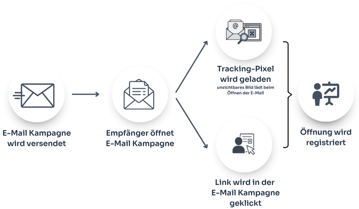 Zusätzlich werden Links in Newslettern meist mit einem Tracking versehen. Klickt ein:e Empfänger:in auf einen Link, wird dies in der Statistik registriert. Auf diese Weise lassen sich Öffnungen, Klicks, Geräteinformationen oder – über die IP-Adresse – auch ungefähre Standortdaten erfassen.