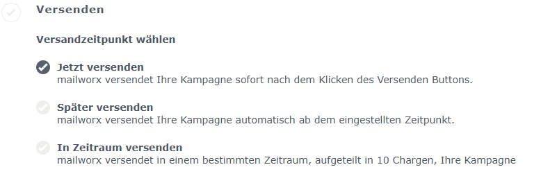 Den Versandzeitpunkt können Sie wie gewohnt im Bereich „Versenden“ auswählen.