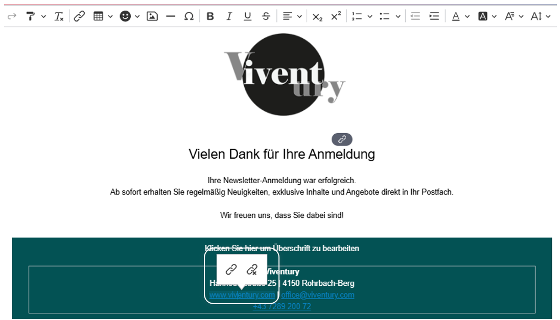Verlinkungen in Landingpages können jetzt einfach bearbeitet werden: Durch Anklicken eines Links im Editor lässt sich dieser anpassen oder entfernen.