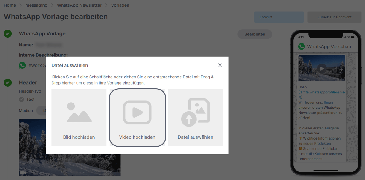 Ab sofort haben Sie die Möglichkeit, in Ihren WhatsApp-Vorlagen neben Bildern auch Videos im mp4-Format als Header-Medium zu verwenden.