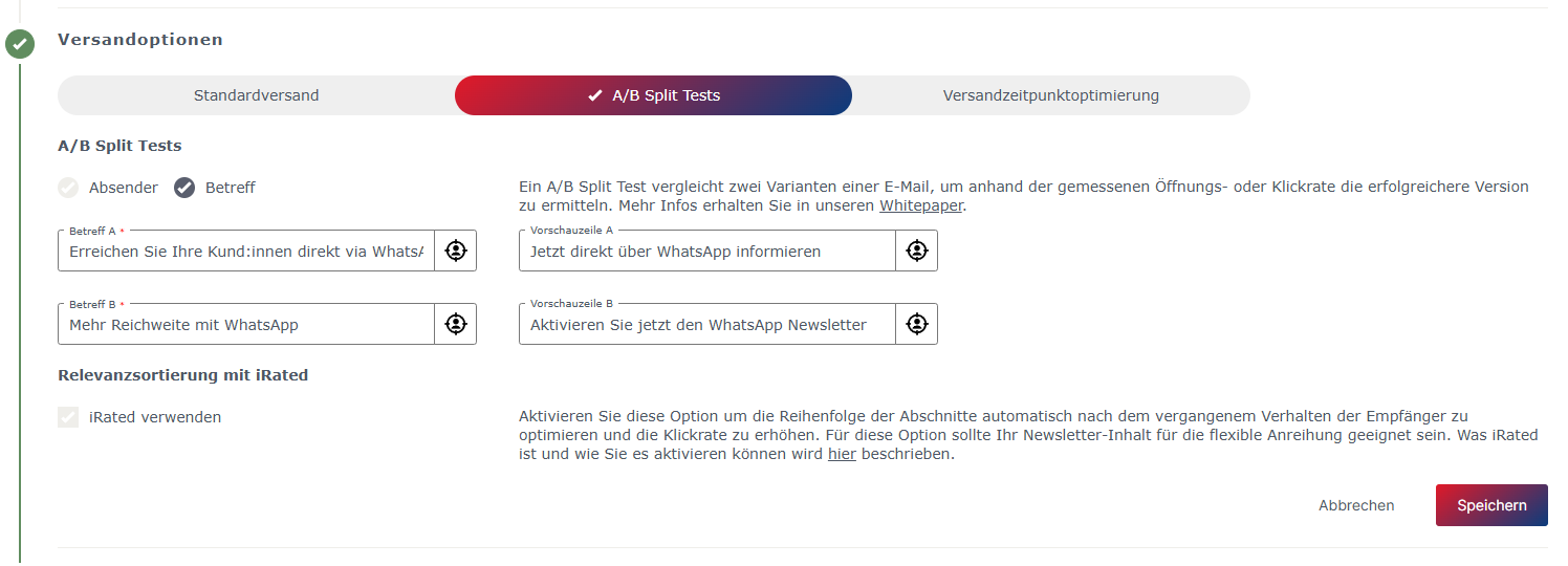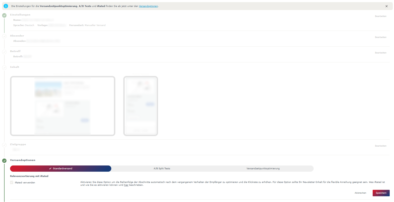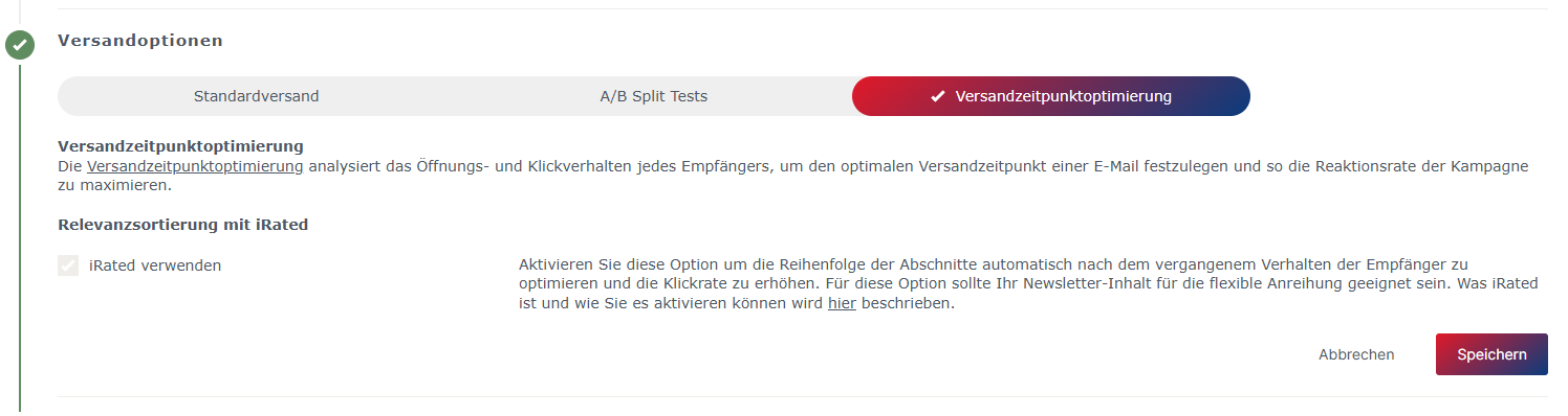 Die Versandoptionen – Versandzeitpunktoptimierung, A/B-Split-Test und iRated – finden Sie nun gebündelt in einem eigenen Bereich. Dort können Sie zwischen Standardversand, A/B-Split-Test und Versandzeitpunktoptimierung wählen.