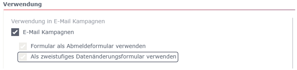 Nach der Änderung wird ein Bestätigungsmail ausgelöst, welches einen Link vom Linktyp „Datenänderungsbestätigung“ enthält. Dazu gibt es nun in den Formularen im Reiter „Verwenden“ die Möglichkeit die Funktion zu aktivieren.