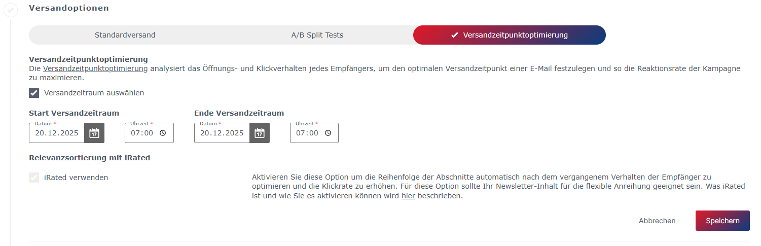Ebenfalls können Sie hier den gewünschten Versandzeitraum auswählen, in der die Kampagne versendet werden soll.